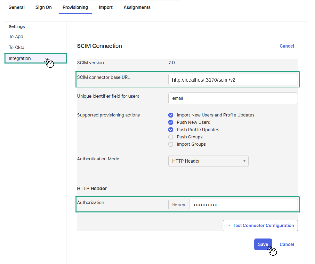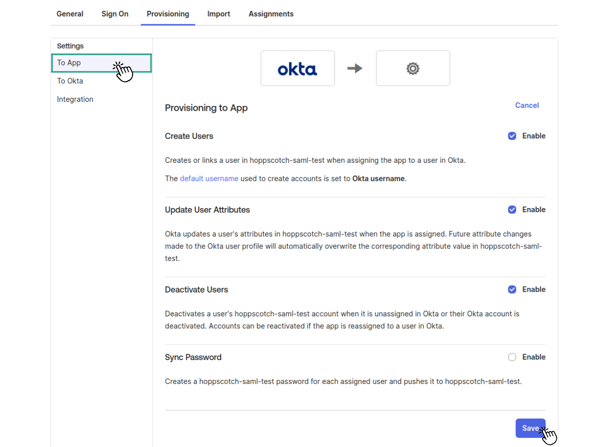 email) and configure provisioning actions (e.g., Import New Users, Profile Updates, Push New Users, Push Profile Updates) according to your requirements. - Use the